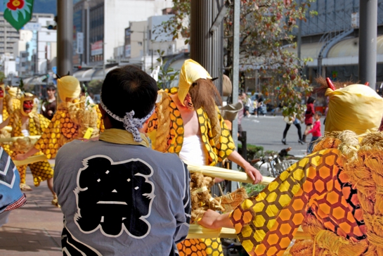呉市では今日、亀山神社で大祭りがありました。各地では10月のはじめから11月3日にかけて小祭りがあります。呉駅前の喫茶『レスト』でモーニングをとって、それからカメラを持って四つ道路あたりへ。そこには整列した赤いはっぴの一群とダンスをしているかのような多くの黄色いヤブ(鬼)がいました。これからいよいよ出陣です。